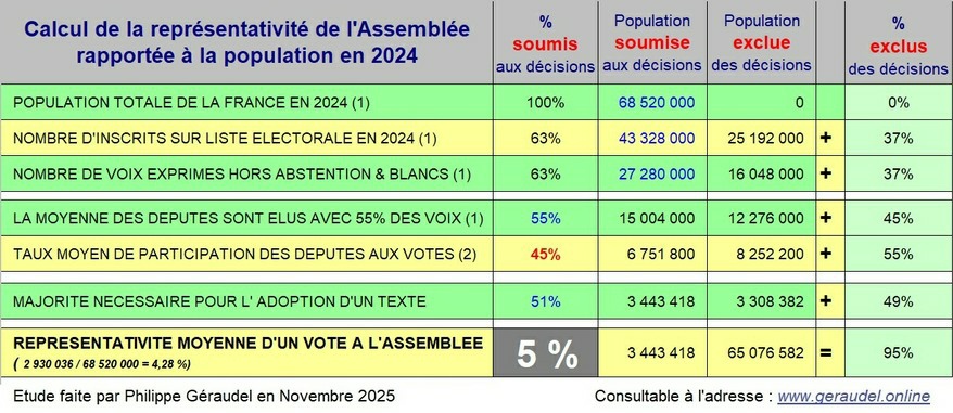 L’étude montre que, sans contester la légitimité juridique de l’assemblée, la représentativité sociologique du vote parlementaire est tombée à un niveau extrêmement faible : 5 %.