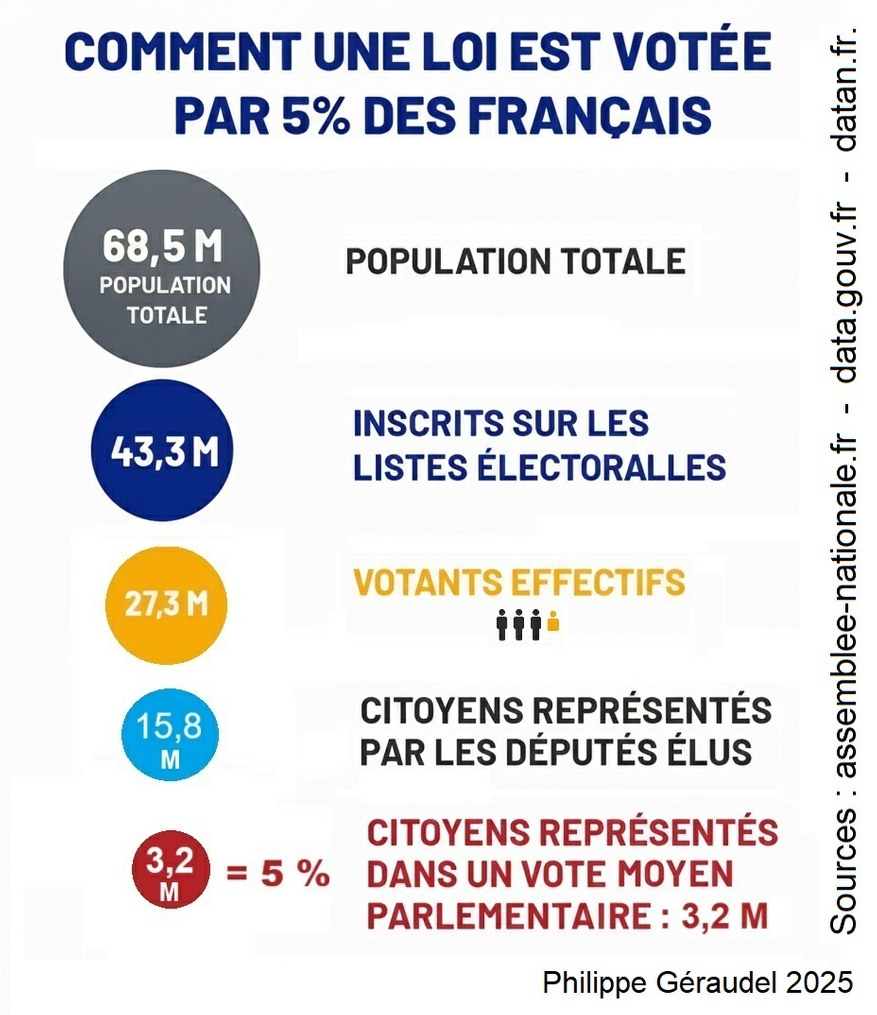 Ainsi, les lois qui s’appliquent à tous proviennent d’un processus où 95 % des Français (mineurs, étrangers, non-